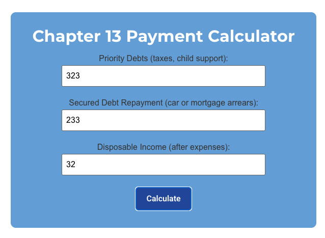 Because the payment amount depends on many financial variables, it can be difficult to estimate without running the numbers. This is why many people begin by using a Chapter 13 calculator to see what their potential payment might look like.